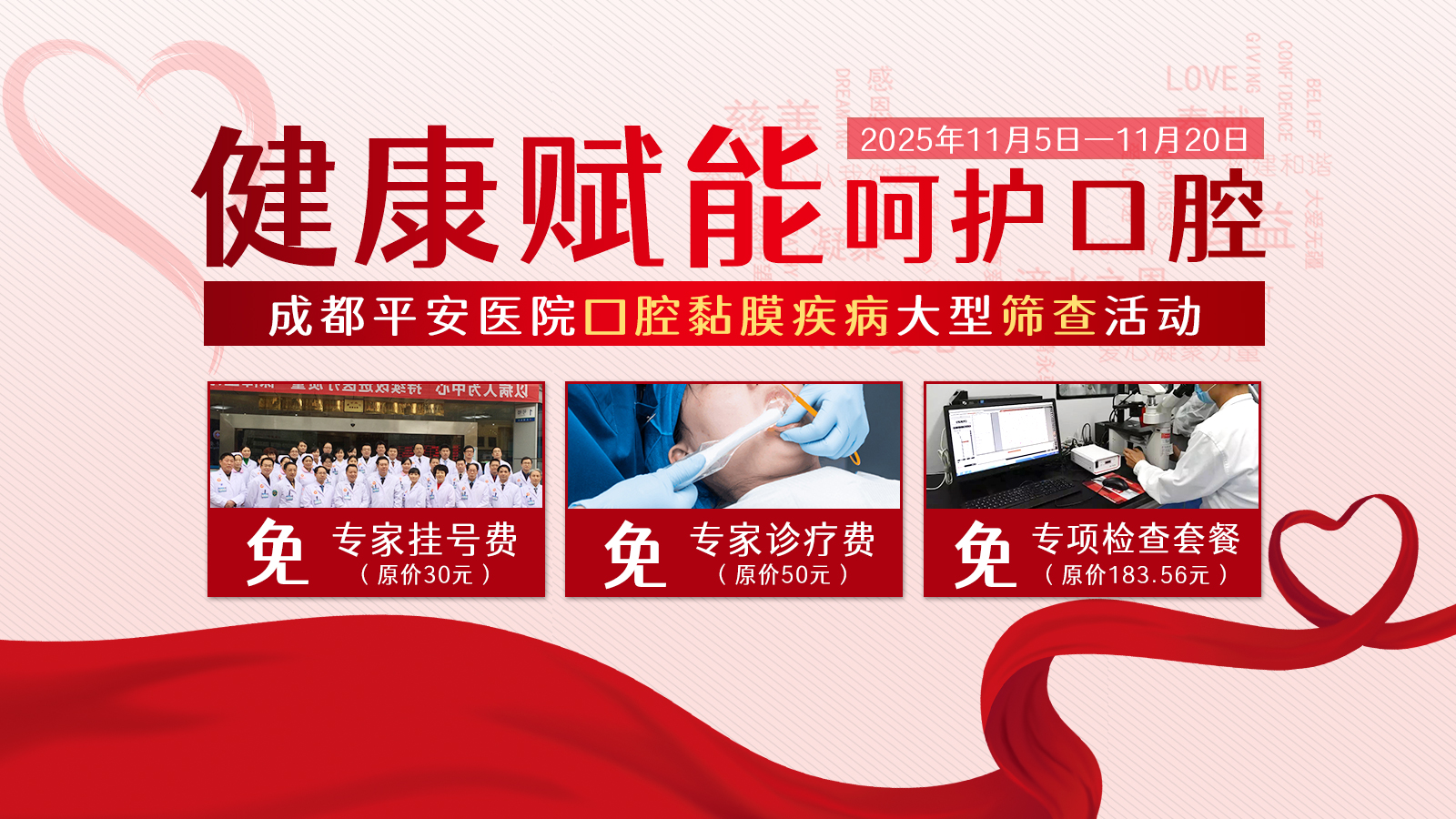 作为我院作为区域口腔黏膜病重点学科,成都平安医院勇担社会责任,将于2025年11月5日至11月20日举办“健康赋能 呵护口腔”大型口腔黏膜病变筛查公益活动。活动旨在推动优质医疗资源普惠于民,助力口腔黏膜疾病实现“早预防、早发现、早治疗”。